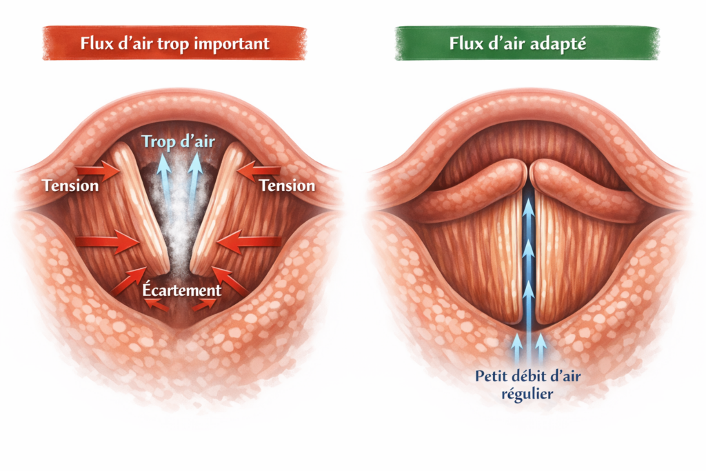La cause précédente est souvent combinée à la troisième cause : celle de l’utilisation inadéquate du flux d’air. En effet, souvent, pour parler plus fort, pour chanter plus haut, beaucoup d’entre nous a le réflexe de « pousser » plus d’air. Malheureusement cette action a pour effet de contracter les cordes vocales qui ne sont pas prévues pour fonctionner avec trop d’air, mais avec un petit débit d’air régulier (l’équivalent serait lorsque vous voulez faire de la buée sur un miroir, sans faire de bruit). Si cette utilisation trop importante du débit d’air n’a lieu que dans certaines zones de la voix, souvent ça ne suffit pas pour la perdre complètement. Néanmoins, on peut grandement la fatiguer. Et si la voix est constamment produite sur un débit d’air excessif, on a de forts risque de la perdre totalement, car les cordes seront sur-sollicitées en permanence ainsi que toute ma musculature qui les entoure (voir illustration ci-dessous). Il faudra dès lors prendre conscience de ces difficultés et trouver des moyens pour réguler ce flux d’air.